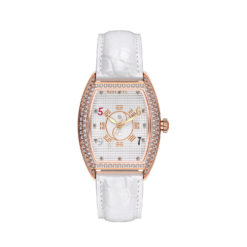 瑞士石英机芯、316L精钢镀18K玫瑰金表壳、蓝宝石表镜、鳄鱼皮表带、水晶